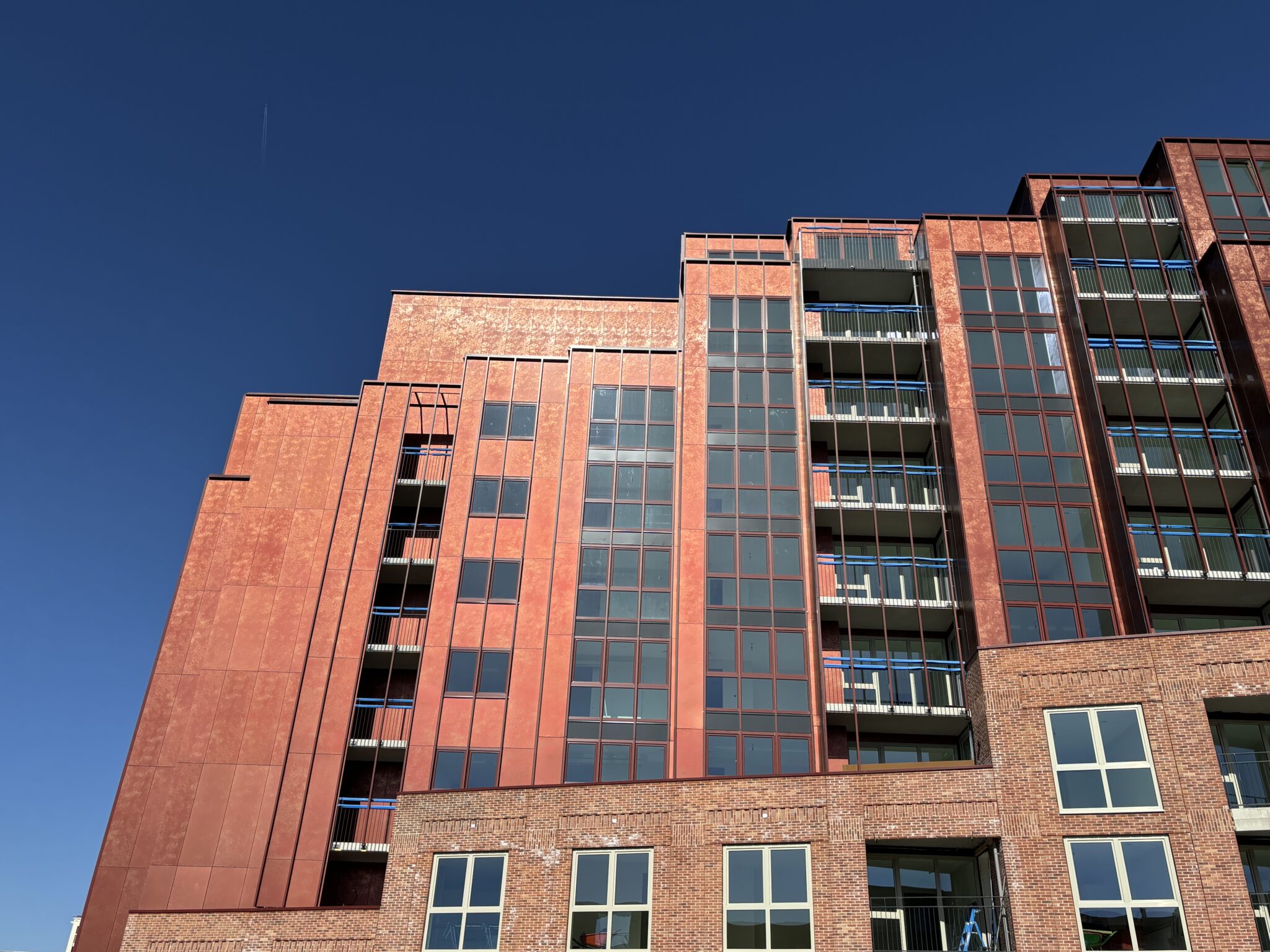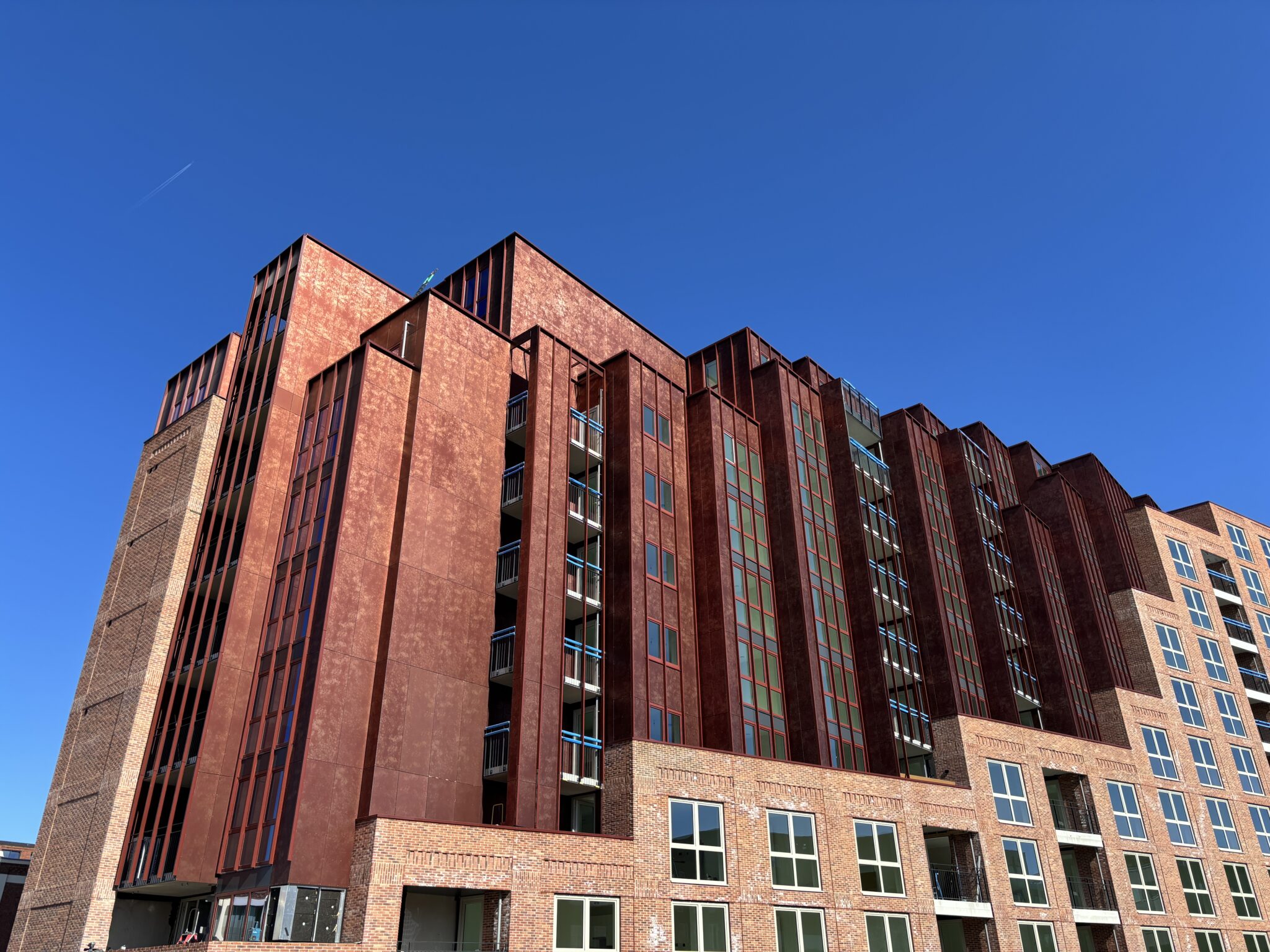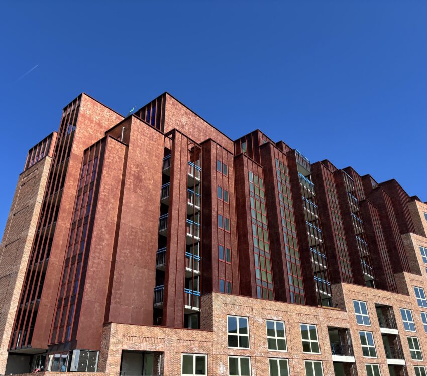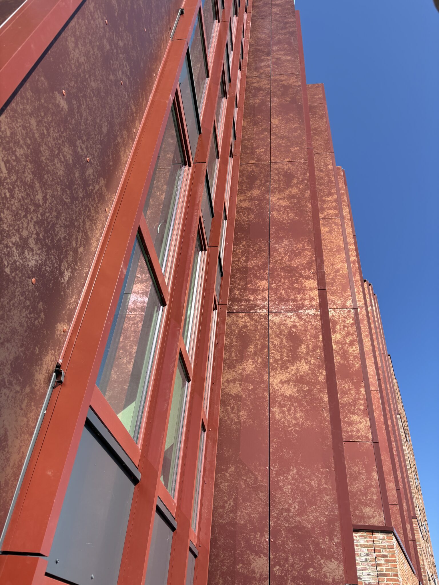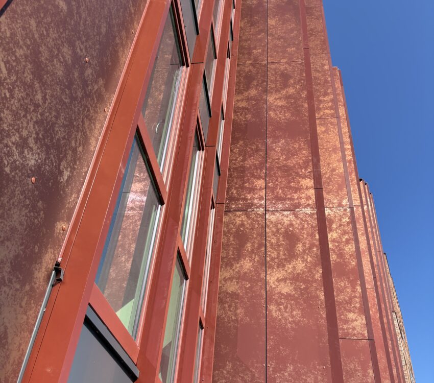 In opdracht van Koopmans Bouwgroep hebben wij 1240m2 Alucobond Panelox AluCopper/AluRed geengineerd, geleverd en gemonteerd. Een schitterend ontwerp met mooie details, unieke kleuren en producten.